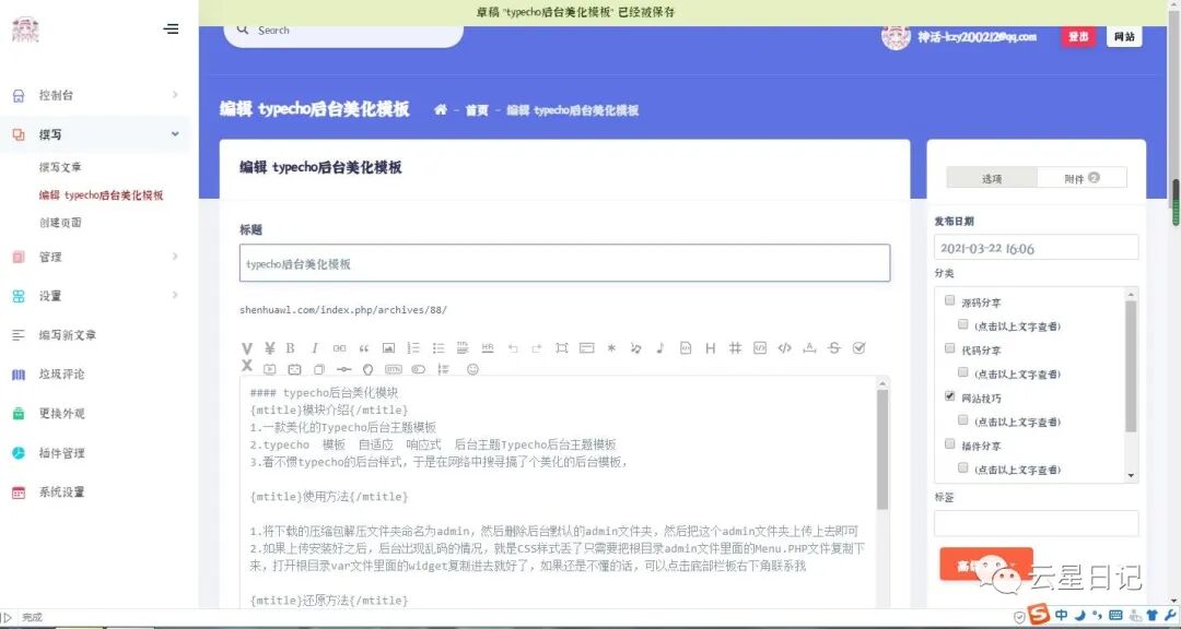3.看不惯typecho的后台样式,于是在网络中搜寻搞了个美化的后台模板,模块使用