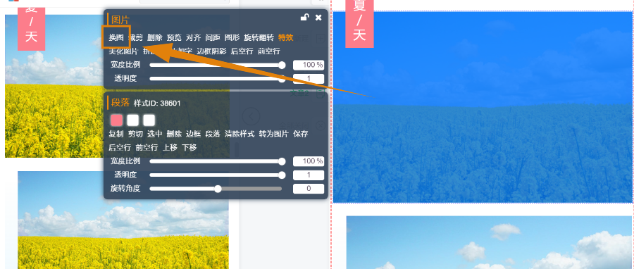 搜索方式和搜索标题、正文样式方法一样。额外要交代的是如何替换样式中的图片。选好样式,点击样式中的图片,就会出现如下图的界面,选“换图”即可。如果你图片很多,点击“换图”时可同时上传多张,这是非常方便的。说到多图,不得不说两种样式了,左右滑动和上下滑动,它可以使得我们即展示了我们想放的所有图,又不至于使得图占位太多,给读者一种看不到头的感觉。