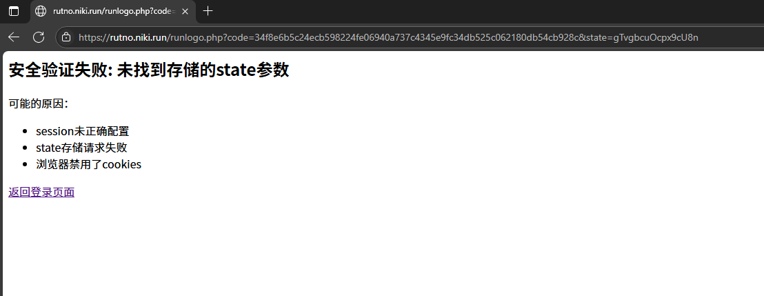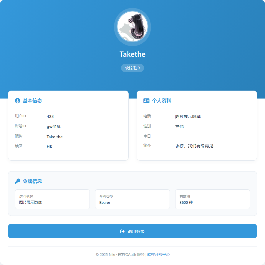 首页(index.html)重定向到授权服务器的身份验证页面,授权服务器会将用户重定向到runlogo.php,url中附带一个code和state,然后使用code向令牌端点请求访问令牌,获得访问令牌后就可以使用它访问账号基本信息,再然后就是返回账号信息字段(具体有什么可以看看https://docs.rutno.com/?category=nopen&doc=oauth2#section-19),然后就会以runlogo.php里面的html的形式来展示账号信息