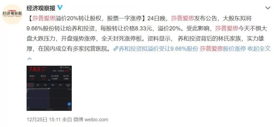 互联网上,关于莎普爱思的最新消息,停留在了2018年12月24日晚,莎普爱思溢价20%转让股权,股票一字涨停。