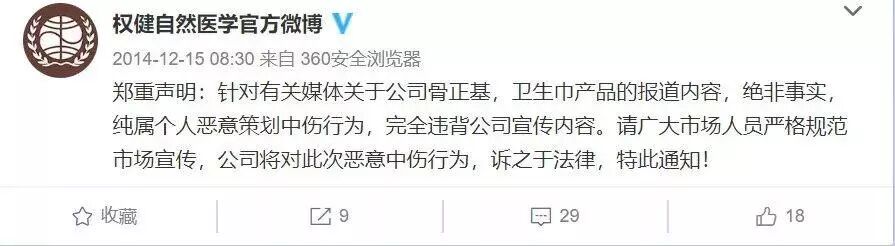 权健自然医学官方微博迅速发布声明,称央视报道内容为“个人恶意策划中伤行为”。