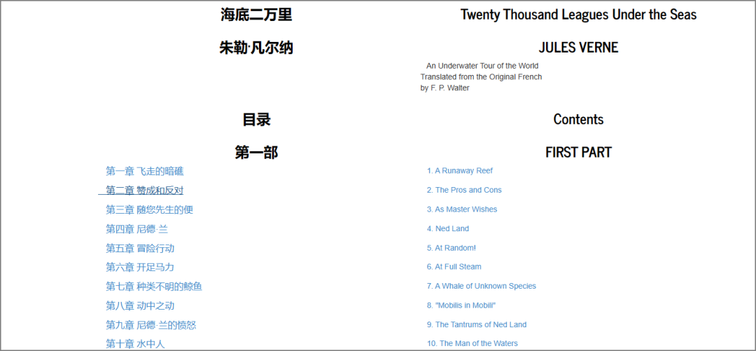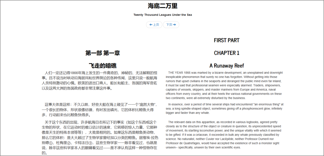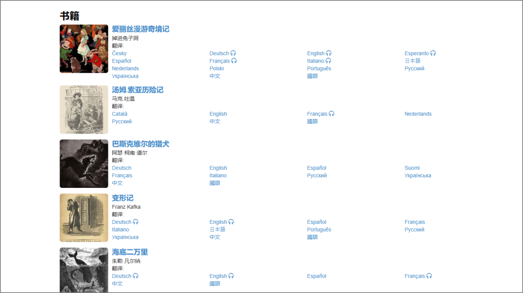 ~01、双语阅读 网址:http://zh.bilinguis.com/一个有趣的工具网站,主要功能是免费双语读物,唯一的缺点就是书籍目前还不是很多,主要有爱丽丝漫游仙境、汤姆索亚历险记、巴斯克维尔的猎犬、变形记以及海底两万里这五本书,关键是还有语音,提供了多种语言对比,非常适合学习外语