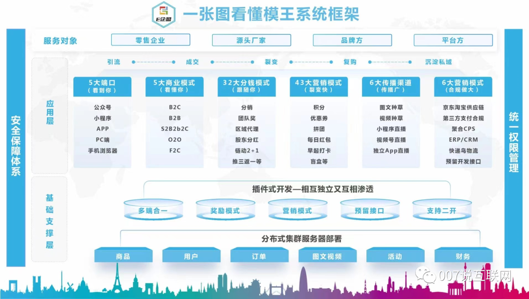 ①安全性是采用大型的电商架构开发与五网融合技术。②支持saas和源代码交付合作。③系统支持接通赋能便民服务接口。④打通了100万品牌产品聚合供应链支持。⑤开发了产品中台供应链食物链顶端管理系统。⑥系统打通了金融支付流水顶端。