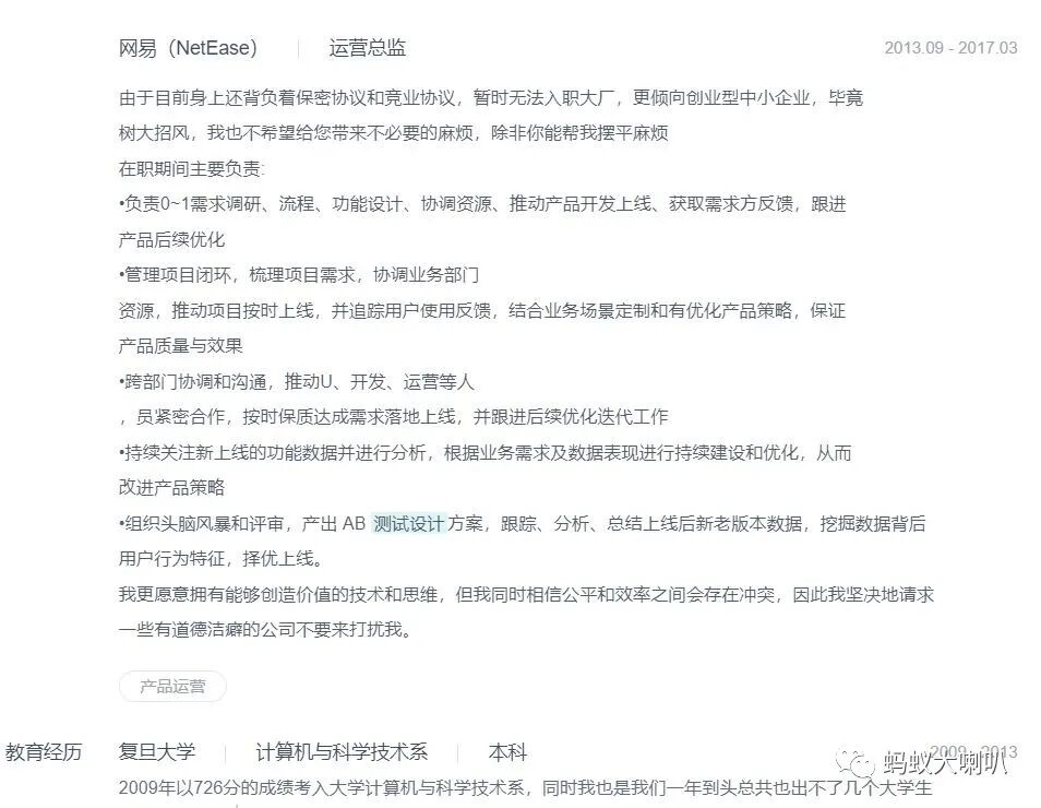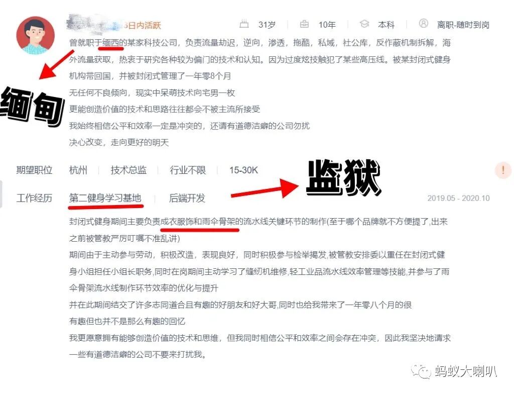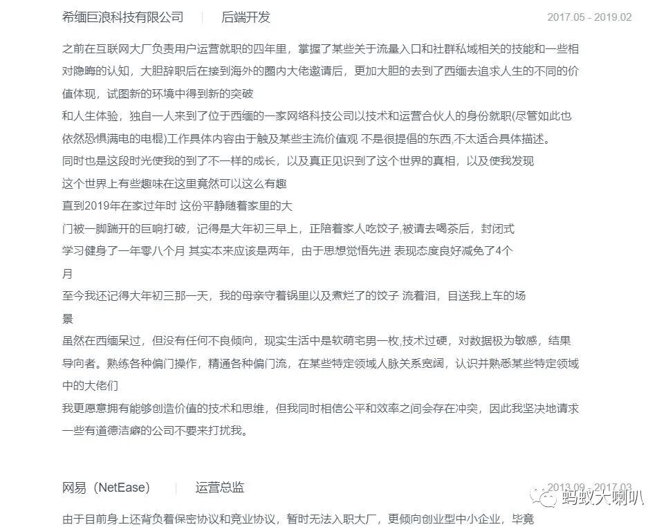 咱先不论这简历中的经历是否真实,单从内容看来,猛地看还真是一头雾水。仔细揣摩其中工作经历,“缅西某家科技公司”、“第二健身学习基地”,明显就是去缅甸诈骗和进监狱劳改吗?这么好的学历,刚毕业就在网易工作还做到总监,如果踏踏实实,说不定也会有个好的前程。