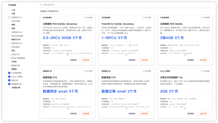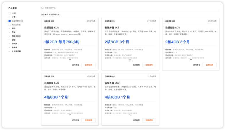 打开 (https://t.aliyun.com/U/DC0800) 这个网址 ,就能看到所有可以免费使用的产品了!
