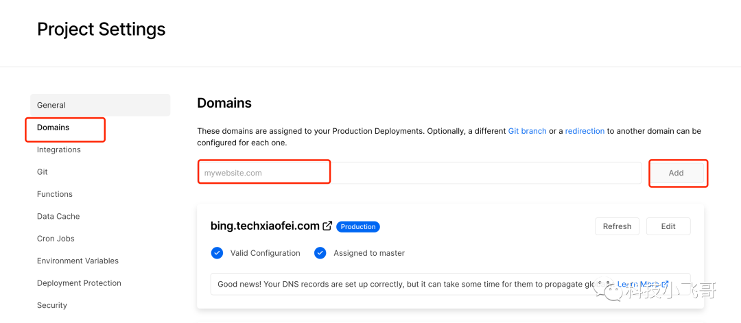 然后点击左边的菜单栏Domain添加域名,这里可以添加顶级域名也可以添加二级域名,我这里添加的是二级域名 bing.techxiaofei.com。
