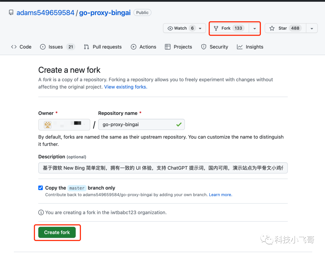 然后点击右上角的Fork也就是克隆,然后点击Create Fork把这个仓库克隆到你的账号下