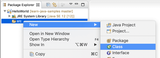 展开刚才创建的“HelloWorld”工程,选中源码目录“src”,然后右键点击,在弹出的菜单中选择“New”-“Class”。