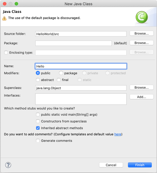 在弹出的新对话框中,为类命名为“Hello”,并点击“Finish”按钮。Eclipse将自动在“src”目录下创建一个名为“Hello.java”的源文件。