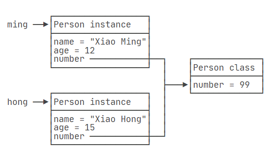 在这个例子中,name和age是实例字段,而number是静态字段。可以看到,尽管ming和hong是两个不同的Person对象,但它们对number字段的修改是相互影响的,因为静态字段在所有实例之间共享。
