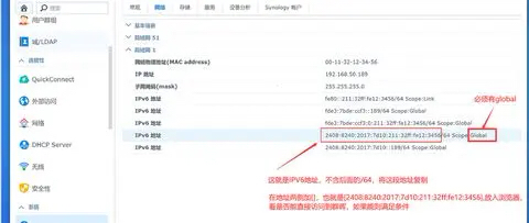 移动个人用户想要拿到公网IP几乎不可能,于是只能考虑使用ipv6地址妥协。因为目前移动为了推广一些监控设备以及某些厂家的个人云,基本所有用户都有ipv6网络,可以通过网址进行测试。光猫会自动分配一个ipv6的端口号,通过光猫或者群晖的管理页面即可得知。只要用流量直连此ipv6地址能进入群晖系统,就说明没有问题了。