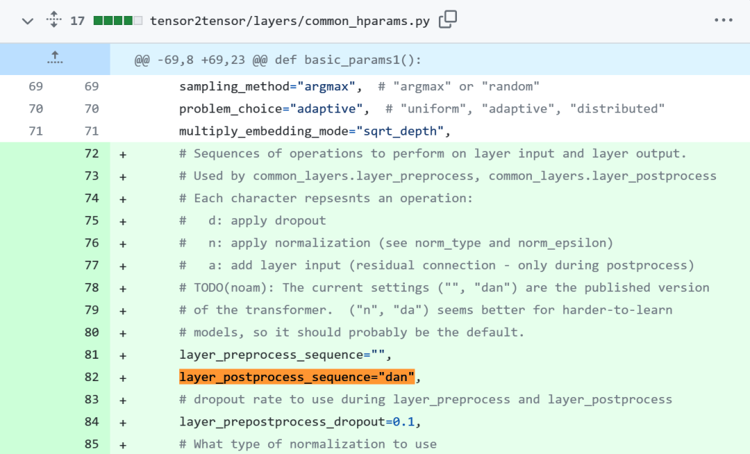 不一致的代码部分如下,其中 82 行写了执行顺序「layer_postprocess_sequence=”dan”」,表示后处理依次执行 dropout、residual_add 和 layer_norm。如果上图左中的 add&norm 理解为:add 在 norm 上面,即先 norm 再 add,那确实代码和图不一致。