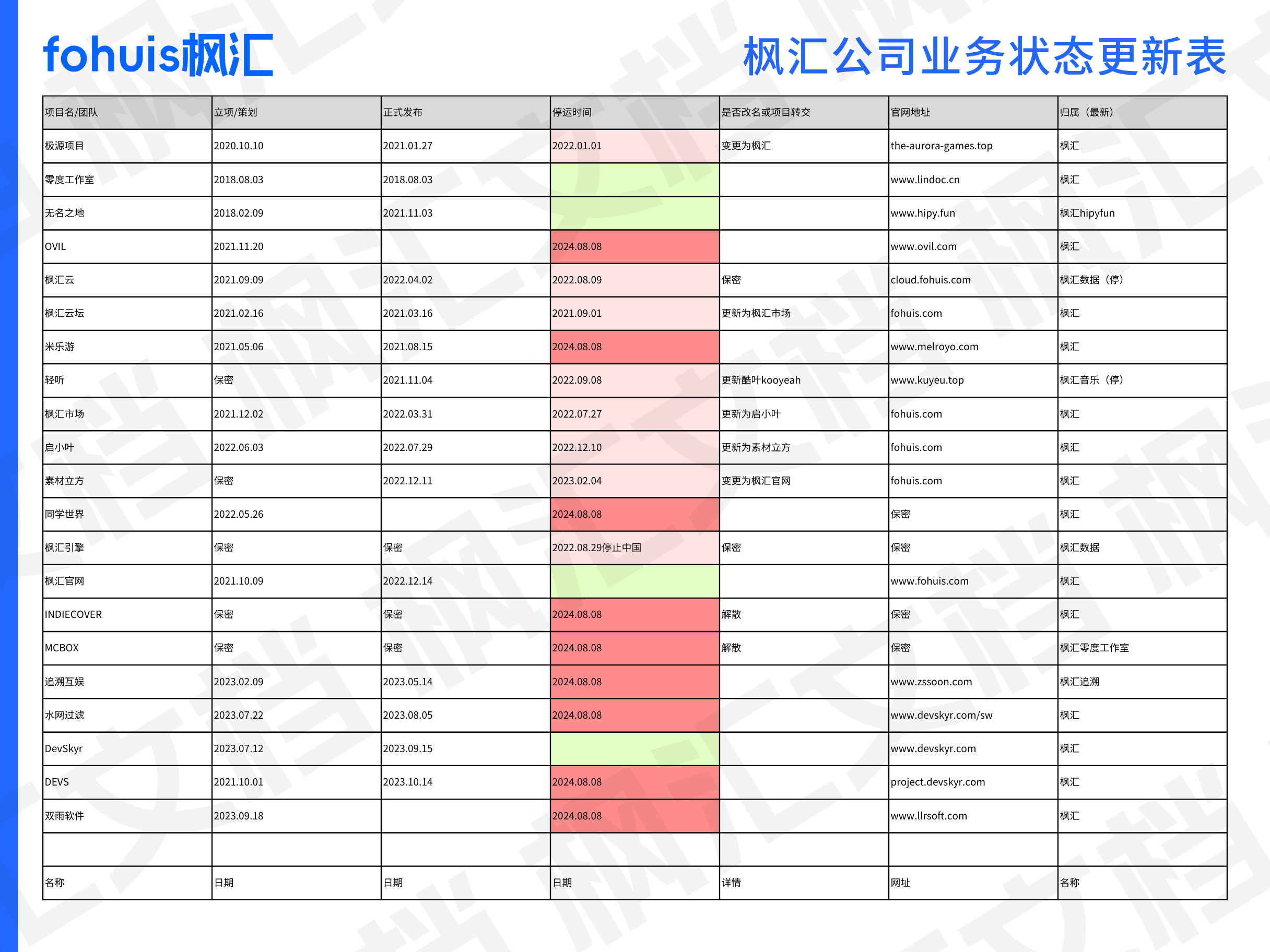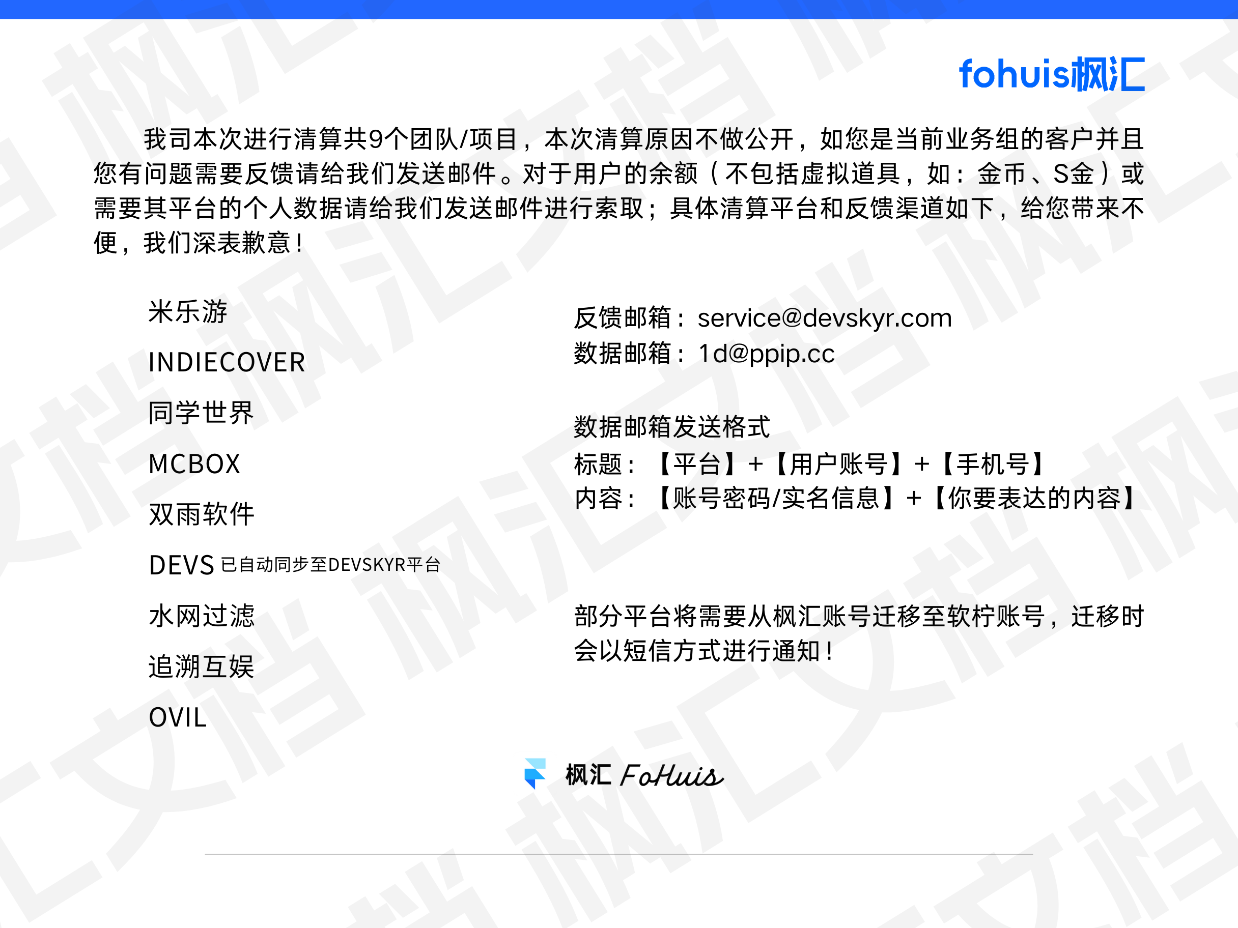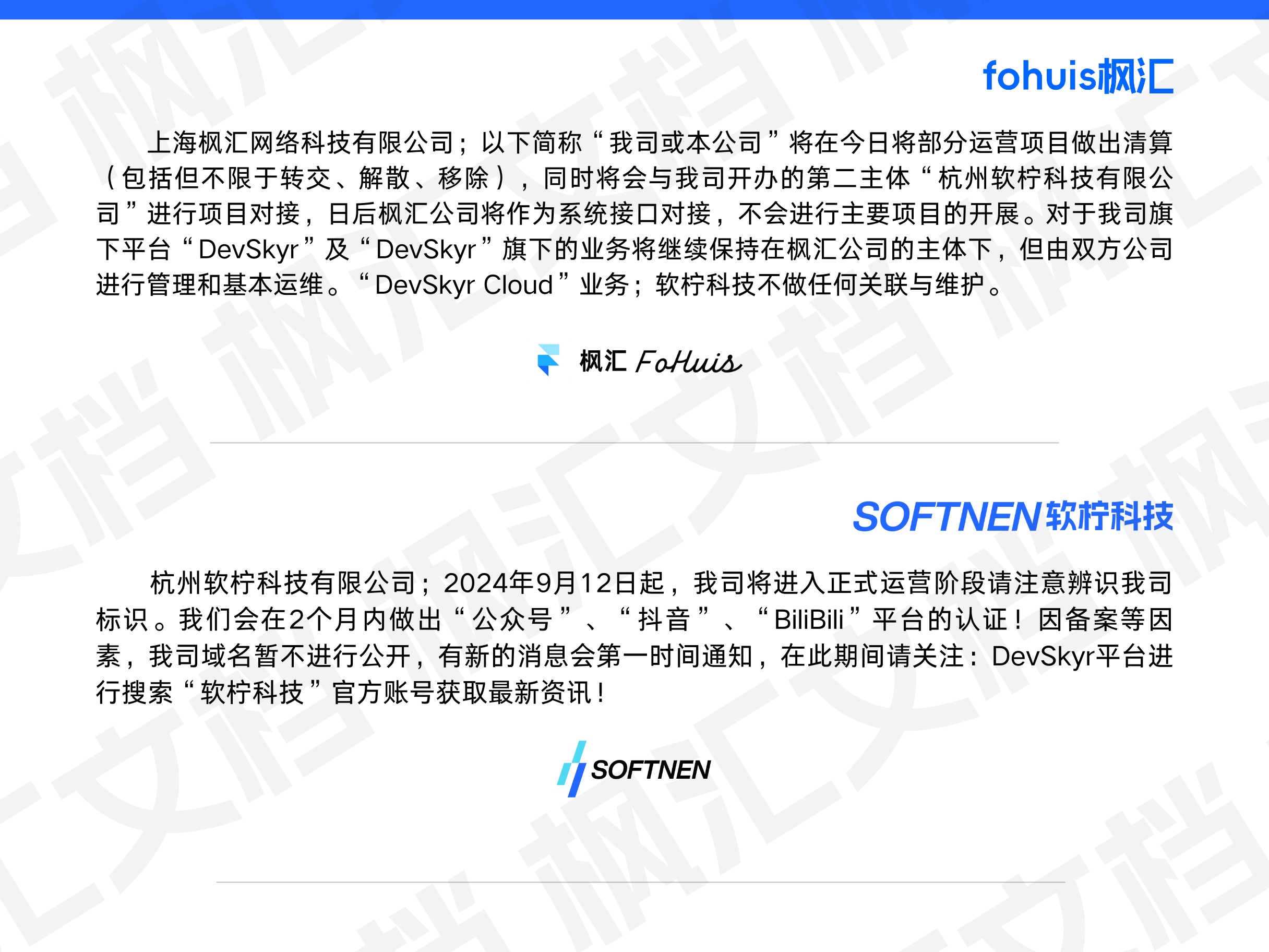 上海枫汇网络科技有限公司;以下简称“我司或本公司”将在今日将部分运营项目做出清算(包括但不限于转交、解散、移除),同时将会与我司开办的第二主体“杭州软柠科技有限公司”进行项目对接,日后枫汇公司将作为系统接口对接,不会进行主要项目的开展。对于我司旗下平台“DevSkyr”及“DevSkyr”旗下的业务将继续保持在枫汇公司的主体下,但由双方公司进行管理和基本运维。“DevSkyr Cloud”业务;软柠科技不做任何关联与维护。