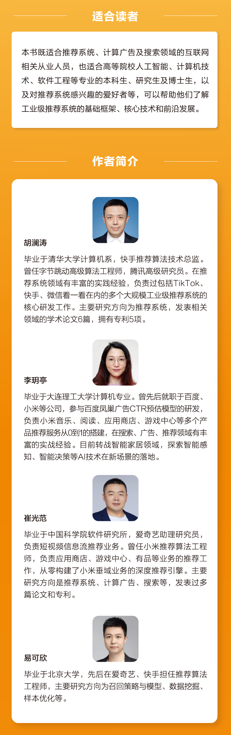 本书的作者们来自各大知名互联网公司,在不同应用场景、不同用户体量的推荐系统研发上均有多年研发经验。