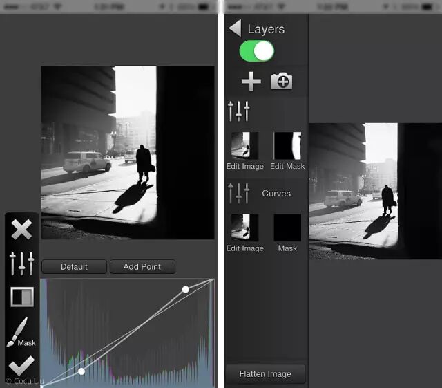Filterstorm好像并不太为人熟知,我基本上拿这个应用当成iPhone简易版的Photoshop。这个app除了有剪裁,对比度,饱和度,曝光调整,锐化等常见工具之外,它还有手机后期应用不太常见的多图层编辑和简易蒙版。我喜欢这两个功能配合用,它能调整照片局部的明度、饱和度、曲线对比度等,尤其做黑白照片的编辑非常实用。其实传统暗房做的也都是类似的事情,只不过挪到了手机上而已。