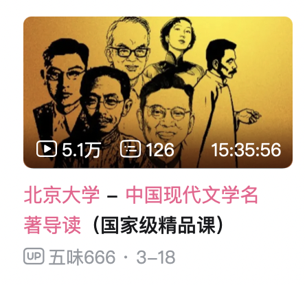 简介:由复旦黄霖、羊列荣、陈维昭、邬国平等古代文学批评史教研室老师执教。关于中国古代文学批评史的网课很少,复旦的这门课弥足珍贵,老师们讲解严谨认真,有PPT展示,配合复旦版的《中国文学批评史新编》复习效果更佳。推荐指数:⭐️⭐️⭐️⭐️网址:https://www.bilibili.com/video/BV1uJ41137VC/?spm_id_from=333.337.search-card.all.click&vd_source=474c03b38a1c0efb9244cb402211e2717.北大-中国现代文学名著导读