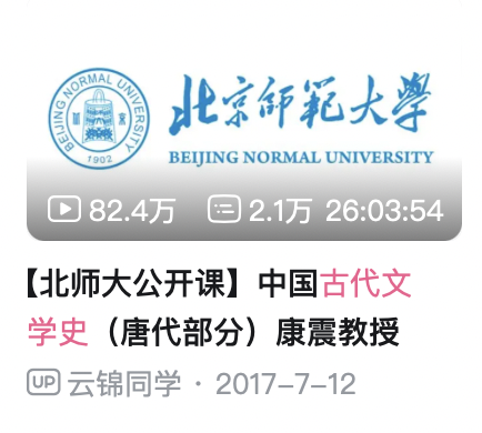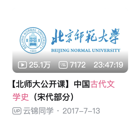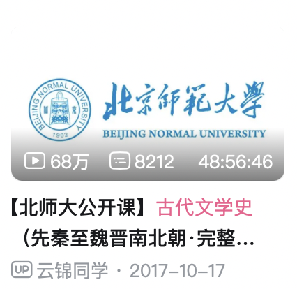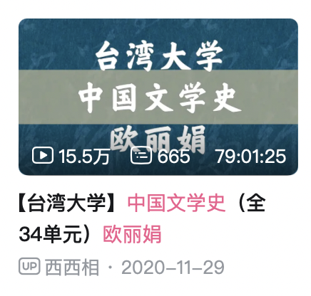 嗨!欢迎回来!这里是孤竹文学!欢迎关注!西瓜酱os:众所周知,大学学习很大程度上依靠自学,考研其实也不例外,在了解考试参考书列表、科目、真题内容后,获得网络课程资源几乎成为了大学生的必修技能。今天西瓜酱就把自己考研历程中看过文学考研领域的高质量优秀网课整理如下,倾囊推荐!大家可根据自己考试的内容进行选择和观看哦!以下课程均来源于哔哩哔哩。一、中文系基础专业课类1.北师大-中国古代文学史 网址:https://www.bilibili.com/video/BV1wW4y1C71z/?spm_id_from=333.337.search-card.all.click&vd_source=474c03b38a1c0efb9244cb402211e271 网址:https://www.bilibili.com/video/BV1jA411M7MB/?spm_id_from=333.337.search-card.all.click&vd_source=474c03b38a1c0efb9244cb402211e271简介:北师大版的中国古代文学史,由北师大尚学峰、康震、马东瑶、郭英德等名师执教。课时系列较长,讲解清晰细致,是极佳的古代文学讲解,对我重新梳理文学史线索,了解具体知识点起到很大的帮助。其中老师们也做了精要的PPT,方便截图笔记和复习。推荐指数:⭐️⭐️⭐️⭐️⭐️网址:https://www.bilibili.com/video/BV1LU4y157fg/?spm_id_from=333.337.search-card.all.click&vd_source=474c03b38a1c0efb9244cb402211e2712.台大欧丽娟-中国文学史上