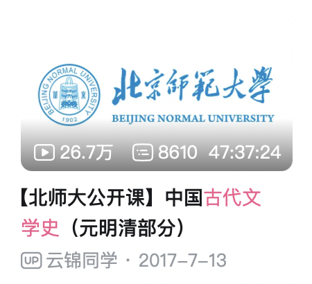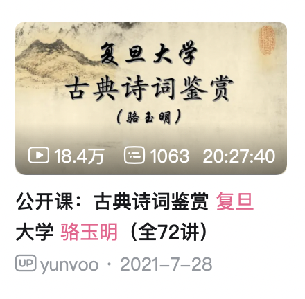 课程来源(台大):http://ocw.aca.ntu.edu.tw/ntu-ocw/ocw/cou/102S104简介:台湾大学中文系欧丽娟教授执教的《中国文学史上》,看她的文学史课程会对文学史有更理性思辨的认知,她的视点更集中于文学的审美特性当中,对于一些文学史上的文学类型有自己独到的见解,尤其是对魏晋南北朝时代的文学现象和发展的分析,给我醍醐灌顶的感受,看完很有启发。但欧丽娟老师的《中国文学史》只讲到南朝宫体诗。之后的唐宋元明清的部分没有收录,是有点可惜的。因此我把她的课程作为北师大版中国古代文学史的补充参考来学习。up主还提供了课件,非常贴心。推荐指数:⭐️⭐️⭐️⭐️网址:https://www.bilibili.com/video/BV1oU4y1a7dc/?spm_id_from=333.337.search-card.all.click&vd_source=474c03b38a1c0efb9244cb402211e2713.复旦骆玉明-古典诗词鉴赏