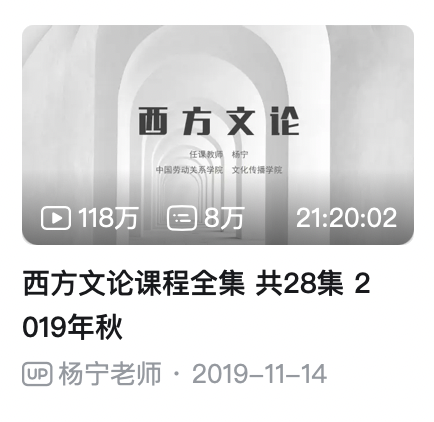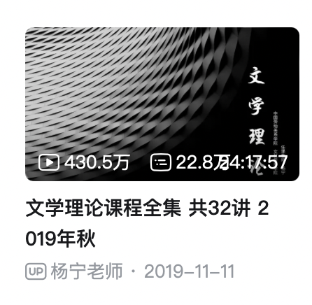 简介:由北大钱理群、孔庆东、等老师执教,讲解现代文学中鲁迅、戴望舒、沈从文、张爱玲、钱钟书的名篇。我比较推荐钱老讲解鲁迅的部分,鲁迅的文章向来是现代文学考察的重点和难点,每一次听钱老解读,都会有新的感受,解读方法也很受用,可以迁移到其他的文本的阅读上。建议先看原文再看讲解,视频年代略久远,老师也无PPT或板书,直接听可能有点懵。推荐指数:⭐️⭐️⭐️网址:https://www.bilibili.com/video/BV1xR4y1V74U/?spm_id_from=333.337.search-card.all.click&vd_source=474c03b38a1c0efb9244cb402211e2718.文艺学类 推荐看杨宁老师的系列课程【裂墙推荐】可直接B站关注杨宁账号 UP主搜索:杨宁老师杨宁-文学理论