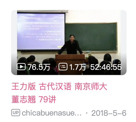 简介:以王力版《古代汉语》为教材的配套教程。由南师大董志翘、何亚南、刘冠才、徐朝东老师执教。因为我是考大综合的古汉部分,所以我比较注重对通论部分的学习。大家可按照考点和自身情况选择相应的内容。评论区有热心课代表总结,大家可按照需要跳看。考古汉相关专业的同学建议可以看完。推荐指数:⭐️⭐️⭐️⭐️