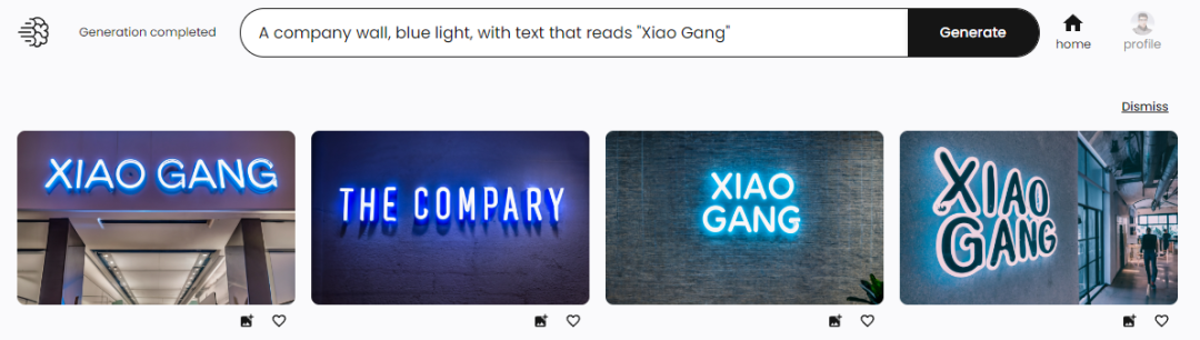使用方法也很简单,只需要输入自然语言或关键词就可以,列如:A company wall, blue light, with text that reads “Xiao Gang”,生成公司形象墙发蓝光的文字。