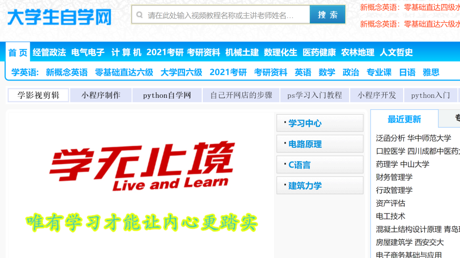 推荐理由:大学自学网是一个完全免费的大学生自学网站,它不仅支持免费在线观看所有学习视频,还支持免费下载所有学习视频。它的学习视频非常丰富全面,并且进行了精心的分类,包括:经管政法、电气电子、人文哲史、歌舞艺术、软件自学网等。
