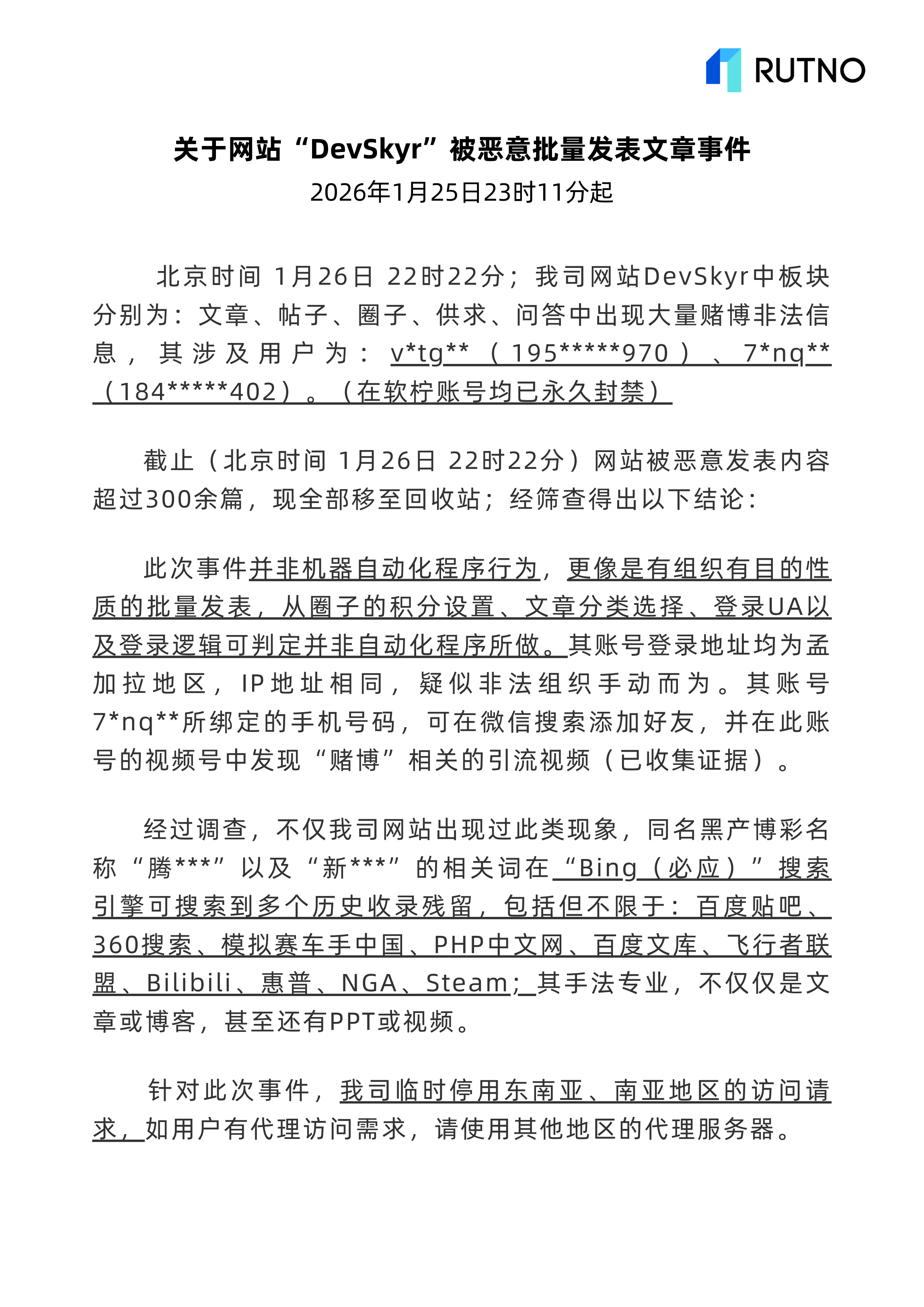 关于网站“DevSkyr”被恶意批量发表文章事件