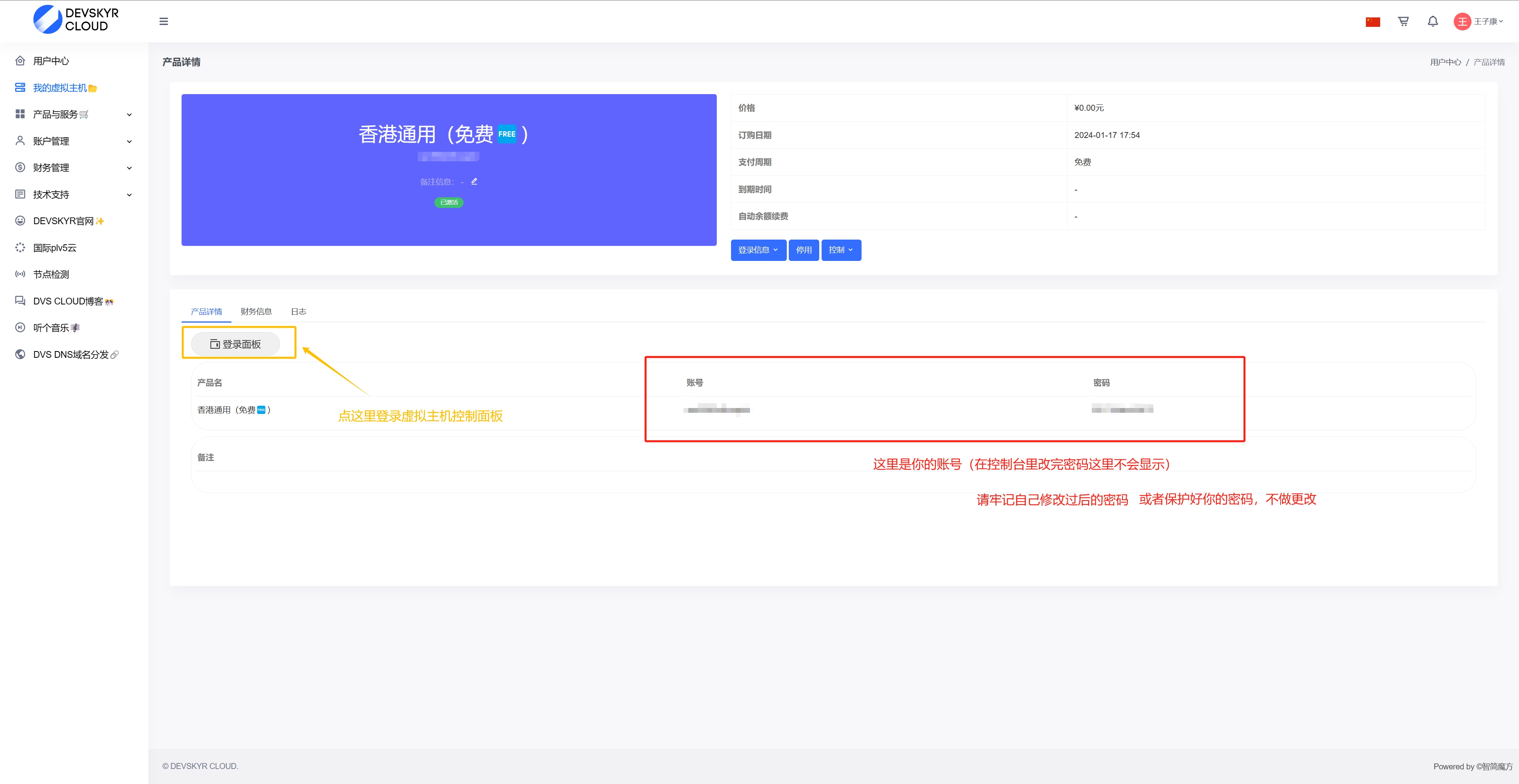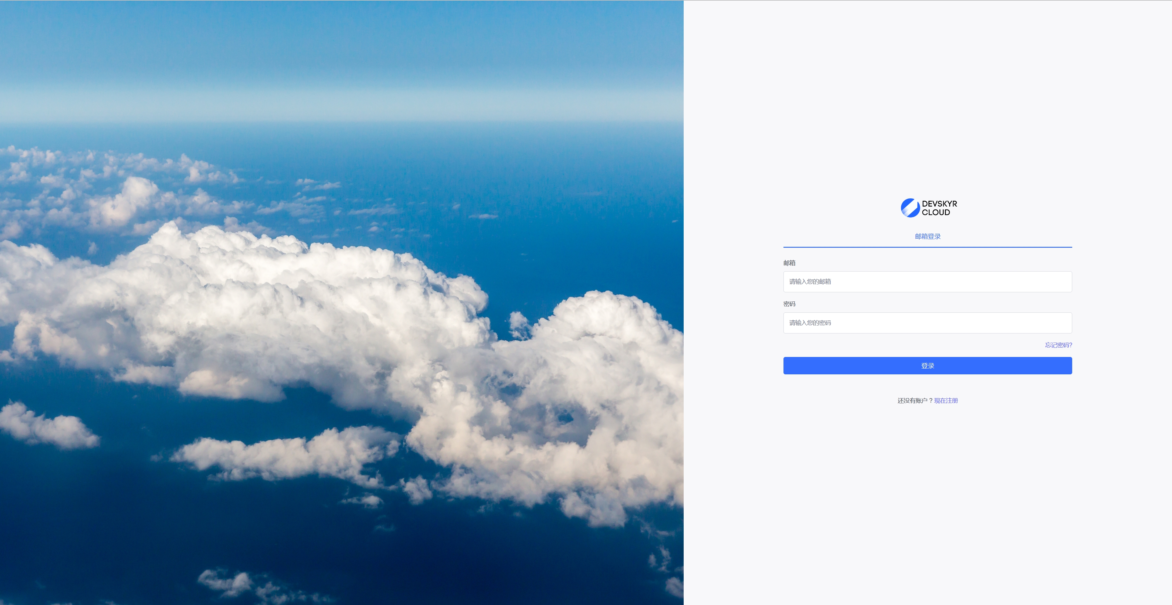在页眉菜单可找到“虚拟主机”的字样,点进去即可,滑倒最下方,即可看到”虚拟主机DEVSKYR CLOUD进入“点击即可,后可见下图登陆界面;
