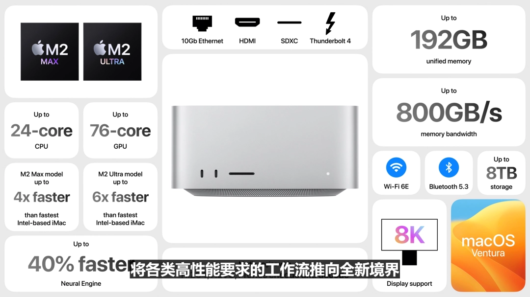除了芯片,Mac Studio 配备了 HDMI、雷电 4 接口,支持 Wi-Fi 6E 和蓝牙 5.3,预装 macOS Ventura 系统。